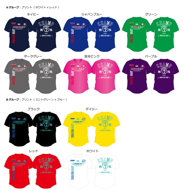 2026年 第12回V9チャンプリーグ記念Tシャツ 現在、在庫限りの通常販売中です。 発送予定は、4月上旬 販売価格:税込送料込み3,900円(会場販売は3,500円) 今シーズンの特別なアイテム、2026年 V9チャンプ記念Tシャツが登場です! 速乾性に優れた素材を使用し、デザイン性が高く、カラフルで着やすいこのTシャツは、あなたのバレーボール愛を引き立てること間違いなしです! この機会をお見逃しなく、チームの応援をTシャツで表現しましょう! サイズ表示:着丈cm×身幅cm 素材:ドライフィット 注意書き:お使いのモニターの発色具合によって、実際のものと色が異なる場合がございます。 収益は、9人制バレーボールの振興・発展に活用させて頂きます。 今シーズンの、チームカラーは以下の通りです。 『ファーストリーグ』 パナソニック ブルーベルズ ジャパンブルー デンソーテン レッドフェニックス レッド マツダ クロス・ナイン ブラック イビデンレグルス ネイビー 日田検診ホワイトドルフィン ホワイト パナソニック津アドバンス ダークグレー 鹿児島銀行レジオンウィングス パープル セイコーエプソン サンセットオレンジ 『セカンドリーグ』 日本体育大学 ジャパンブルー 東京女子体育大学 ネイビー 関西福祉大学 ピンク 日本女子体育大学 ブラック 『男子ファーストリーグ』 中部徳洲会病院 グリーン 住友電工伊丹 未定 日本無線 レッド 富士通 ネイビー 住友電工 パープル JFE西日本 ジャパンブルー 横河電機 デイジー JT東京 ネイビー リコー東北 ネイビー パナソニック津 ジャパンブルー
